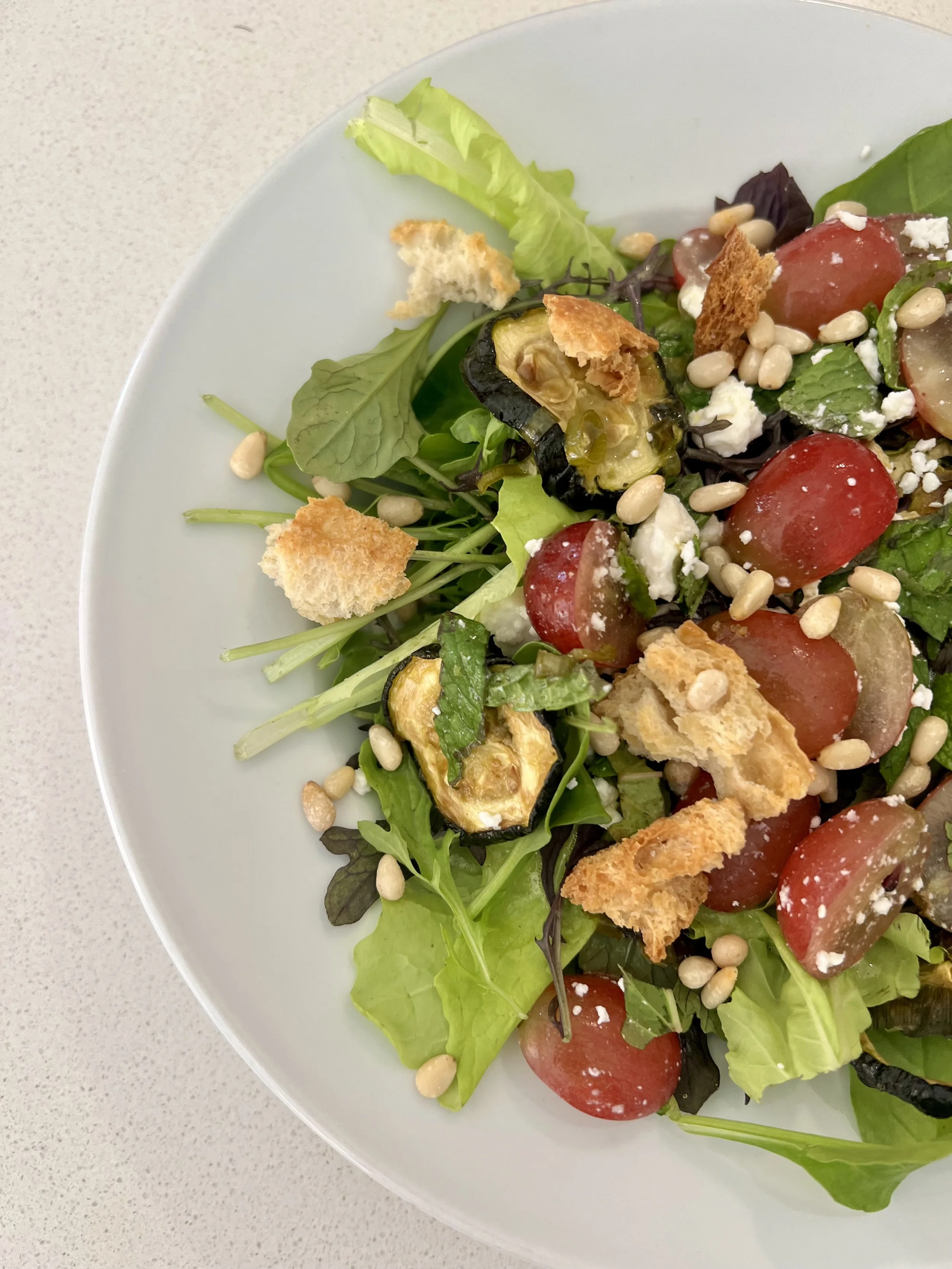 Incorporate all ingredients in the salad - add feta cheese, sliced grapes, zucchini, pine nuts, and croutons. Mix in dressing to taste and toss with fresh mint and green onions. Add salt and pepper to taste.